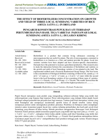 Rosalina, Fitria and Lia, Amalia and Kovertina, Rakhmi Indriana (2024) The effect of biofertilizer concentration on growth and yield of three local Sumedang varieties of rice (Oryza sativa L.) in dryland. Jurnal Pertanian Terapan (ROCE), 1 (2): 14. pp. 167-172. ISSN 3032-4505