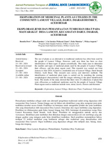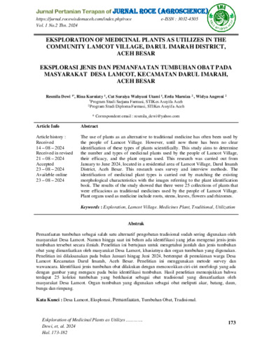 Resmila, Dewi and Rina, Kurniaty and Cut, Suraiya Wahyuni Utami and Erda, Marniza and Widya, Angreni (2024) Eksploration of medicinal plants as utilizes in the Community Lamcot Village, Darul Imarah District, Aceh Besar. Jurnal Pertanian Terapan (ROCE), 1 (2): 15. pp. 173-182. ISSN 3032-4505