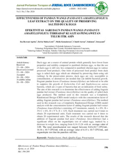 Duck eggs are a source of animal protein which generally have lower foam properties and stability compared to purebred chicken eggs, so that the use of duck eggs is still very less compared to purebred chicken eggs in various processed food products. One form of processed food product from duck eggs is salted duck eggs which are obtained by preserving them using salt (salting). In the preservation process, duck eggs are very susceptible to contamination, so alternatives are needed that can inhibit bacterial growth. Fragrant pandan leaves (Pandanus Ammaryllifolius) are believed to be able to suppress the growth of Escherichia Coli and Staphylococcus aureus bacteria, which are 2 types of bacteria that are an indication of food safety. The aim of this research is to determine the effectiveness of adding fragrant pandan leaf extract (Pandanus Amoryllifolius) on the quality of salted duck eggs produced. The method used in this research was a Completely Randomized Design (CRD) model analysis with the concentration factor of adding fragrant pandan leaf extract (Pandanus amaryllifolius). The method used in this research was a Completely Randomized Design (CRD) model analysis with the concentration factor of adding fragrant pandan leaf extract (Pandanus Amaryllifolius) consisting of 5 treatments, namely A = 0%, B = 3% C = 6%, D = 9 %, E = 12%. Each treatment was carried out 4 times to obtain 20 experimental units. Each treatment was carried out 4 times to obtain 20 experimental units. The results of the research showed that the addition of fragrant pandan leaf juice (Pandanus Amoryllifolius) had a significant effect on the organoleptic test of salted eggs, marked by a decrease in weight loss, ranging from 0,14-13,26 with an average value of 3.09. The total microbacterial test ranged between 0.63x10-7 CFU/mL- 16.16 x 10-7 CFU/mL with an average value of 6.15 x 10-7 CFU/mL, and organoleptic test that the panelists still like.