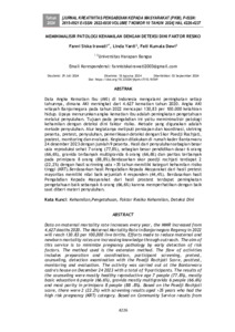 Data Angka Kematian Ibu (AKI) di Indonesia mengalami peningkatan setiap tahunnya, dimana AKI meningkat dari 4.627 kematian tahun 2020. Angka AKI wilayah Banjarnegara pada tahun 2022 mencapai 130,83 per 100.000 kelahiran hidup. Upaya menurunkan angka kematian ibu adalah peningkatan pengetahuan melalui penyuluhan. Tujuan pada pengabdian ini yaitu meminimalisir patologi kehamilan dengan deteksi dini faktor risiko. Metode yang digunakan adalah metode penyuluhan. Alur kegiatanya meliputi persiapan dan koordinasi, skrining peserta, pretest, penyuluhan, pemeriksaan deteksi dengan Skor Poedji Rochjati, postest, monitoring dan evaluasi. Kegiatan dilakukan di rumah kader Bantarwaru 24 desember 2023 dengan jumlah 9 peserta. Hasil dari penyuluhan sebagian besar usia reproduksi sehat 7 orang (77,8%), sebagian besar pendidikan dasar 6 orang (66,6%), gravida terbanyak multigravida 6 orang (66,6%) dan paritas terbanyak pada primipara 8 orang (88,8%).Berdasarkan skor poedji rochjati terdapat 2 (22,2%) dengan hasil scrinning usia >35 tahun memiliki kategori kehamilan risiko tinggi (KRT).Berdasarkan hasil Pengabdian Kepada Masyarakat dari hasil pretest mayoritas memiliki nilai baik sejumlah 4 responden (44,4%). Berdasarkan hasil Pengabdian Kepada Masyarakat dari hasil prostest terdapat peningkatan pengetahuan baik sebanyak 6 orang (66,6%) karena memperhatikan dengan baik saat diberi materi penyuluhan.