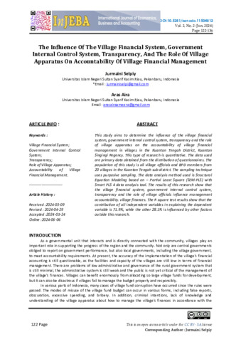Jurmaini, Selpiy and Aras, Aira (2024) The influence of the village financial system, government internal control system, transparency, and the role of village apparatus on accountability of village financial management. InJEBA : International Journal of Economics, Business and Accounting, 2 (2): 1. pp. 122-136. ISSN 3032-3754