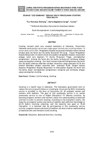 Tiur, Romatua Sitohang and Maria, Magdalena Saragi and Yusniar, Yusniar (2024) Edukasi “gizi seimbang“ sebagai upaya pencegahan stunting pada Balita. Jurnal Kreativitas Pengabdian kepada Masyarakat, 7 (10): 4. pp. 4260-4268. ISSN 2615-0921