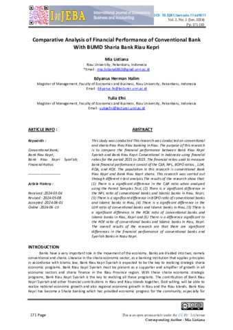 Mia, Listiana and Edyanus, Herman Halim and Yulia, Efni (2024) Comparative analysis of financial performance of conventional bank with BUMD Sharia Bank Riau Kepri. InJEBA : International Journal of Economics, Business and Accounting, 2 (2): 4. pp. 171-183. ISSN 3032-3754