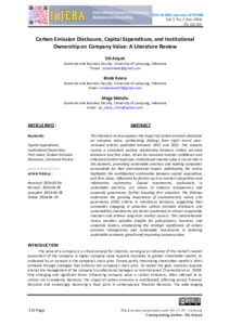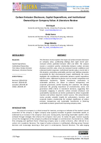 SIti, Aisyah and Einde, Evana and Mega, Metalia (2024) Carbon emission disclosure, capital expenditure, and institutional ownership on company value: a literature review. InJEBA : International Journal of Economics, Business and Accounting, 2 (2): 7. pp. 212-218. ISSN 3032-3754