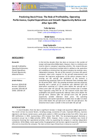 Yulia, Apriana and Einde, Evana and Usep, Syaipudin (2024) Predicting stock prices: the role of profitability, operating performance, capital expenditure and growth opportunity before and after spin-offs. InJEBA : International Journal of Economics, Business and Accounting, 2 (2): 8. pp. 219-229. ISSN 3032-3754