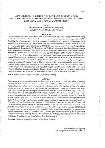 Cooperativ e-learning adalah pembelajaran dimana peserta di dik bekerja dalam kelompok kecil untuk saling membantu satu sama lain dalam mempelajari bahan ajar, menurut Warsono dan Har i yanto(2013: l 75). Penelitian ini dilakukan dalam dua fase pelaksanaan pembelajaran. Penelitian ini bertujuan untuk meningkatkan kreativitas belajar profil pelajar Pancasila dan prestasi belajar peserta didik di kelas XI (fase E ) SMA Negeri I Ende, tahun pelajaran 2022-2023, pada mata pelajaran Pendidikan Agama Katolik dan Budi Pekerti dengan sub topik: "Kesetaraan Laki-laki dan Perempuan". Penelitian ini mengacu pada model Arikunto dkk (2007 : 57), yang terdiri dari empat komponen: perencanaan, pelaksanaan , observasi, dan refleksi. Penelitian dilakukan di kelas X-1 (fase E) SMA Negeri I Ende, selama 2 X 45 menit jam pelajaran. Data-data dikumpulkan melalui observasi dan tes. Analisis data menggunakan analisis deskriptif kualitatif dan kuantitatif, dan analisis komparatif. Dari hasil a na l is i s Assesmen Tengah Semester (ATS) tcrhadap peserta didik , menunjukkan sebagai berikut: (I) Cooperative Learning dapat meningkatkan kreativitas belajar profil pelajar Pancasila. Hal ini bisa dilihat dari rata-rata nilai basil observasi terhadap aktivitas belajar peserta didik mcncapai 62,70% (rendah) pada fasc pertama (I), dan meningkat 96,05% (Sangat Tinggi) pada fase kedu a (II). Basil Assesmen Tengah Semester (ATS) peserta didik fase E (X-1) setelah pelaksanaan kegiatan pcmbelajaran dengan metode cooperative learning mengalami peningkatan, rata-rata persentase skor penilaian : 59,00 pada fase pertama (I) dan 95,00% pada fase kedua (II).