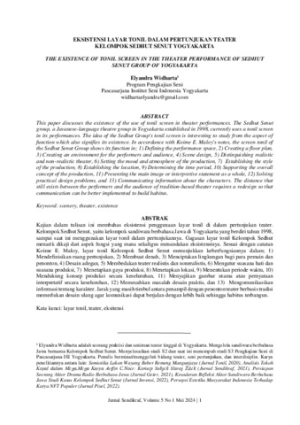 Elyandra, Widharta (2024) Eksistensi layar tonil dalam pertunjukan teater kelompok sedhut senut Yogyakarta. Jurnal Pendidikan Seni dan Industri Kreatif (Sendikraf), 5 (1): 1. pp. 1-10. ISSN 2746-3605