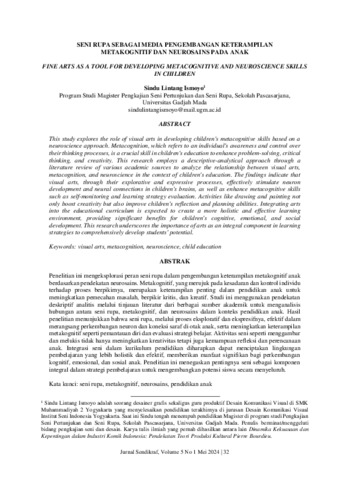 Sindu, Lintang Ismoyo (2024) Seni rupa sebagai media pengembangan keterampilan metakognitif dan neurosains pada anak. Jurnal Pendidikan Seni dan Industri Kreatif (Sendikraf), 5 (1): 5. pp. 32-39. ISSN 2746-3605
