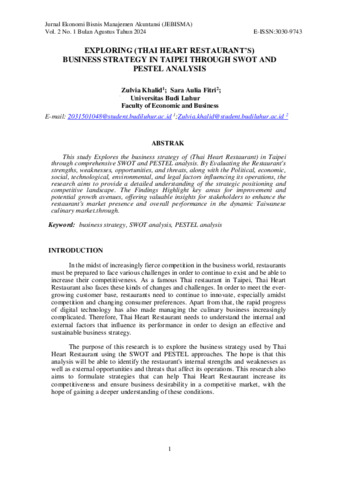 Zulvia, Khalid and Sara, Aulia Fitri (2024) Exploring (Thai Heart Restaurant’s) business strategy in Taipei through SWOT and PESTEL analysis. Jurnal Ekonomi Bisnis Manajemen Akuntansi (JEBISMA), 2 (1): 8. pp. 1-8. ISSN 3030-9743