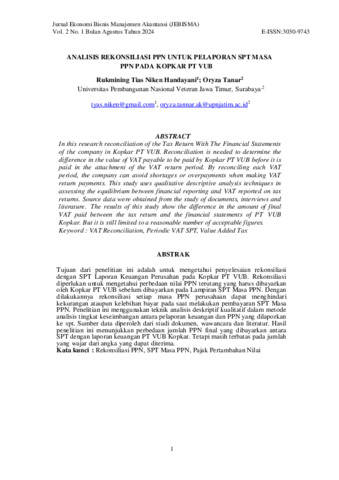 Rukmining, Tias Niken Handayani and Oryza, Tanar (2024) Analisis rekonsiliasi ppn untuk pelaporan SPT Masa PPN pada Kopkar PT VUB. Jurnal Ekonomi Bisnis Manajemen Akuntansi (JEBISMA), 2 (1): 10. pp. 1-9. ISSN 3030-9743