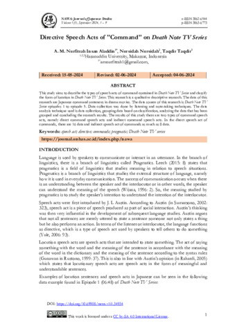 A.M. Nurfitrah, Insan Aladdin and Nursidah, Nursidah and Taqdir, Taqdir (2024) Directive speech acts of "command" on death note tv series. Journal of Japanese Studies (NAWA), 1 (1): 1. pp. 1-9. ISSN 3062-6773