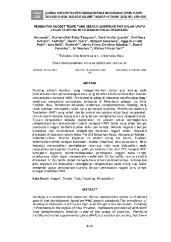 Misrawati, Misrawati and Nurhannifah, Rizky Tampulon and Desti, Arnita Juandri and Dwi, Nova Indriani and Fadhilah, Fadhilah and Hendri, Putra and Hidayati, Askerlena and Ingga, Kurnialis Putri and Ipna, Melti and Kholisoh, Kholisoh and Merry, Silvya Christine Nababan and Naomi, Feronika and Sri, Wardani and Wahyu, Firman Sari (2024) Pembuatan nugget tempe tahu sebagai modifikasi PMT dalam upaya cegah stunting di Kelurahan Palas Pekanbaru. Jurnal Kreativitas Pengabdian kepada Masyarakat, 7 (10): 15. pp. 4369-4380. ISSN 2615-0921