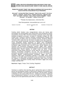 Stunting adalah keadaan yang menggambarkan status gizi kurang pada pertumbuhan dan perkembangan anak yang bersifat kronis berdasarkan standar pertumbuhan menurut WHO. Prevalensi stunting di Indonesia masih cukup tinggi meskipun mengalami penurunan, termasuk di Pekanbaru sebagai Ibu Kota Propinsi Riau. Pemberian makanan tambahan (complementary feeding) yang tidak adekuat merupakan salah satu penyebab stunting. Pemberian Makanan Tambahan (PMT) yang sehat dan bervariasi merupakan solusi bagi masyarakat, namun masih banyak masyarakat yang belum mengetahui cara pengolahannya. Tujuan pengabdian kepada masyarakat ini adalah untuk meningkatkan pengetahuan dan keterampilan dalam mengolah PMT balita yang sehat berupa pembuatan nugget berbahan dasar tahu dan tempe. Metode kegiatan berupa sosialisasi dan demonstrasi pengolahan makanan nugget sehat. Kegiatan dilakukan di halaman rumah Ketua RW 008 Kelurahan Palas, Kecamatan Rumbai, Pekanbaru-Riau. Peserta kegiatan ini adalah orang tua balita. Evaluasi keberhasilan dinilai dengan kuesioner, lembar observasi, dan wawancara. Hasil kegiatan menunjukkan peningkatan rata-rata nilai yang didapatkan pada penyuluhan pencegahan stunting, yaitu pemahaman ibu dari 71% menjadi 85%. Kemudian kegiatan mendemonstrasikan pembuatan nugget tahu tempe sebelumnya tidak dapat menyebutkan sebanyak 12 ibu balita namun setelah dilakukan 12 ibu balita dapat menyebutkan proses pembuatannya. Kesimpulan dari kegiatan ini didapatkan peningkatan pengetahuan pada orang tua balita mengenai upaya pencegahan stunting dengan pembuatan nugget tahu tempe sebagai modifikasi PMT.