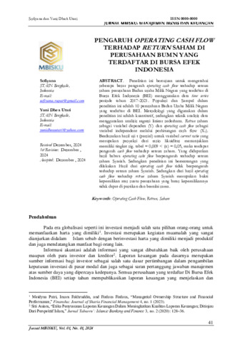 Sofiyana, Sofiyana and Yuni, Dhea Utari (2024) Pengaruh operating cash flow terhadap return saham di perusahaan BUMN yang terdaftar di Bursa Efek Indonesia. Jurnal Manajemen Bisnis dan Keuangan (MBISKU), 1 (1): 5. pp. 41-49. ISSN 3047-4914