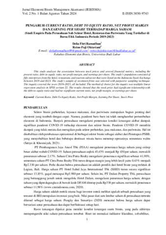 Delia, Fitri Ramadhan and Retno, Fuji Oktaviani (2024) Pengaruh current ratio, debt to equity ratio, net profit margin dan earning per share terhadap harga saham (studi empiris pada perusahaan sub sektor hotel, restoran dan pariwisata yang terdaftar di Bursa Efek Indonesia periode 2019-2023). Jurnal Ekonomi Bisnis Manajemen Akuntansi (JEBISMA), 2 (1): 11. pp. 1-10. ISSN 3030-9743