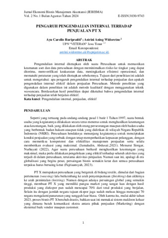 Ayu, Carolin Ruripratiti and Astrini, Aning Widoretno (2024) Pengaruh pengendalian internal terhadap penjualan PT X. Jurnal Ekonomi Bisnis Manajemen Akuntansi (JEBISMA), 2 (1): 18. pp. 1-13. ISSN 3030-9743