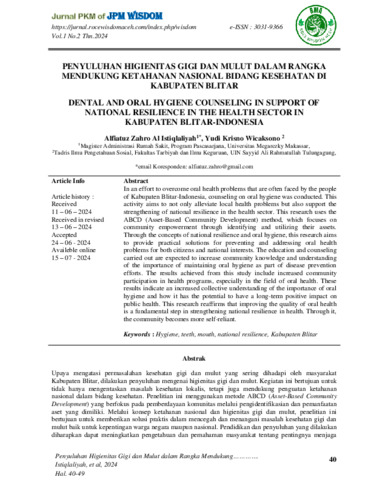 Alfiatuz, Zahro Al Istiqlaliyah and Yudi, Krisno Wicaksono (2024) Penyuluhan higienitas gigi dan mulut dalam rangka mendukung ketahanan nasional bidang kesehatan di Kabupaten Blitar. Jurnal Pengabdian Kepada Masyarakat Wisdom (WISDOM), 1 (2): 2. pp. 40-49. ISSN 3031-9366