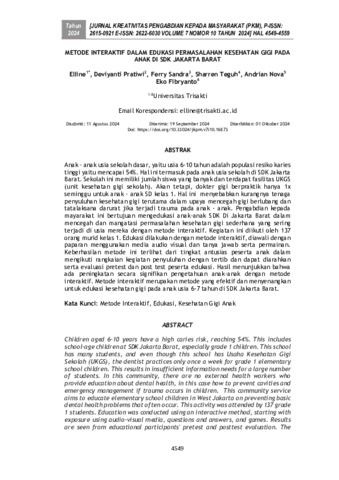 Elline, Elline and Deviyanti, Pratiwi and Ferry, Sandra and Sharren, Teguh and Andrian, Nova and Eko, Fibryanto (2024) Metode interaktif dalam edukasi permasalahan kesehatan gigi pada anak di SDK Jakarta Barat. Jurnal Kreativitas Pengabdian kepada Masyarakat, 7 (10): 32. pp. 4549-4559. ISSN 2615-0921