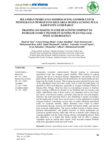 Khairun, Nisa and Liston, Siringo Ringo and Teuku, Athaillah and Dedy, Darmansyah and Muhammad, Reza Aulia and Abdul, Muzammil and Safrika, Safrika and Fantashir, Awwal Fuqara and Irvan, Subandar and Munandar, Munandar and Alfizar, Alfizar and Muhammad, Sayuthi (2024) Pelatihan pembuatan kompos eceng gondok untuk peningkatan pendapatan keluarga di Desa Gunong Pulo, Kabupaten Aceh Barat. Jurnal Pengabdian Kepada Masyarakat Wisdom (WISDOM), 1 (2): 8. pp. 86-93. ISSN 3031-9366