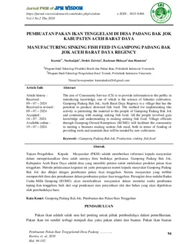 Kurnia, Kurnia and Nurhatijah, Nurhatijah and Dedek, Zulvira and Rachmat, Hidayat and Humeira, Humeira (2024) Pembuatan pakan ikan tenggelam di Desa Padang Bak Jok Kabupaten Aceh Barat Daya. Jurnal Pengabdian Kepada Masyarakat Wisdom (WISDOM), 1 (2): 9. pp. 94-102. ISSN 3031-9366