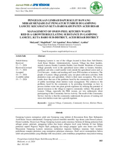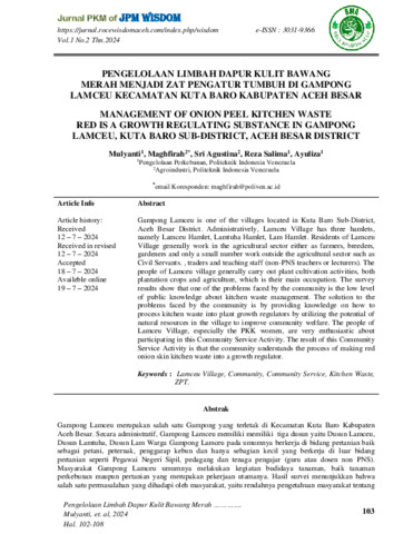Mulyanti, Mulyanti and Maghfirah, Maghfirah and Sri, Agustina and Reza, Salima and Ayuliza, Ayuliza (2024) Pengelolaan limbah dapur kulit bawang merah menjadi zat pengatur tumbuh di Gampong Lamceu Kecamatan Kuta Baro Kabupaten Aceh Besar. Jurnal Pengabdian Kepada Masyarakat Wisdom (WISDOM), 1 (2): 10. pp. 103-108. ISSN 3031-9366