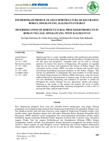 Nur, Fajar Febtysiana and Th. Candra, Wasis and Ichsan, Ichsan and Adi, Marjani and Revi, Sesario and Dody, Radiansah and Janne, Hillary (2024) Diversifikasi produk olahan hortikultura di Kelurahan Roban, Singkawang, Kalimantan Barat. Jurnal Pengabdian Kepada Masyarakat Wisdom (WISDOM), 1 (2): 11. pp. 109-117. ISSN 3031-9366