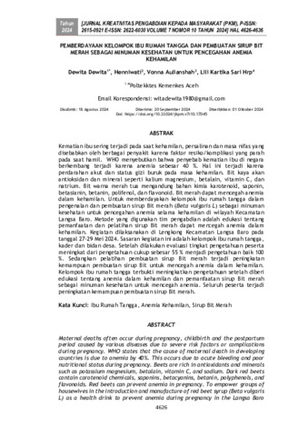 Dewita, Dewita and Henniwati, Henniwati and Vonna, Aulianshah and Lili, Kartika Sari Hrp (2024) Pemberdayaan kelompok ibu rumah tangga dan pembuatan sirup bit merah sebagai minuman kesehatan untuk pencegahan anemia kehamilan. Jurnal Kreativitas Pengabdian kepada Masyarakat, 7 (10): 37. pp. 4626-4636. ISSN 2615-0921