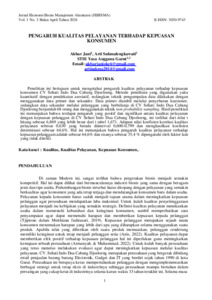 Penelitian ini bertujuan untuk mengetahui pengaruh kualitas pelayanan terhadap kepuasan konsumen CV Sehati Indo Dua Cabang Djoeloeng. Metode penelitian yang digunakan yaitu kuantitatif dengan pendekatan asosiatif, sedangkan teknik pengumpulan data dilakukan dengan menggunakan data primer dan sekunder. Data primer diambil melalui penyebaran kuesioner, sedangkan data sekunder melalui pelanggan yang berbelanja di CV Sehati Indo Dua Cabang Djoeloeng berjumlah 68 orang dan menggunakan teknik non probability sampling. Hasil penelitian ini menunjukan bahwa terdapat pengaruh yang positif dan signifikan antara kualitas pelayanan dengan kepuasan pelanggan di CV Sehati Indo Dua Cabang Djoeloeng, ini terlihat dari nilai t hitung sebesar 6,869 yang lebih besar dari t tabel 1,671. Adapun nilai koefisien korelasi kualitas pelayanan sebesar 0,630 yang berada diinterval 0,600-0,799 dan menghasilkan koefisien determinasi sebesar 64,6%. Hal ini menunjukan bahwa pengaruh kualitas pelayanan terhadap kepuasan pelanggam adalah sebesar 64,6% dan sisanya sebesar 35,4 % dipengaruhi oleh faktor lain yang tidak diteliti.