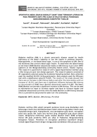Suardi, Suardi and Ernawati, Ernawati and Patmawati, Patmawati and Zainuddin, Zainuddin and Nurfateha, Nurfateha and Najihah, Najihah (2024) Efektivitas media edukasi booklet smart DSME terhadap literasi DM pada penderita DMT2 pra ulkus di Wilayah Kerja Puskesmas Mangarabombang Kabupaten Takalar. Manuju: Malahayati Nursing Journal, 6 (10): 1. pp. 4691-4698. ISSN 2655-2728