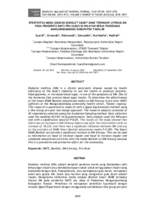 Diabetes mellitus (DM) adalah penyakit pankreas kronis yang disebabkan oleh kekurangan insulin atau ketidakmampuan tubuh untuk menggunakan insulin yang diproduksi dengan baik. Hiperglikemia, atau peningkatan gula darah, merupakan salah satu gejala DM. Salah satu hormon yang mengontrol gula darah adalah insulin. Mengetahui efektivitas media edukasi Booklet Smart DSME terhadap literasi DM pada penderita DMT2 pra ulkus di Puskesmas Mangarabombang Kabupaten Takalar. Penelitian ini merupakan penelitian kuantitatif dengan metode Quasi Eksperiment dengan menggunakan pendekatan One group pre-post tes design. Subjek penelitian terdiri dari 30 responden yang dipilih dengan metode Accidental Sampling. Pengumpulan data menggunakan kusioner HLS-EU-16-Q yang telah dimodifikasi. Analisa data menggunkana Uji Wilcoxon dengan nilai signifikansi P>0,05. Hasil penelitian menunjukkan bahwa terjadi peningkatan literasi DM sebelum dan setelah intervensi dengan peningkatan 18.333, dan ada pengaruh yang signifikan antara Literasi DM terhadap pemberian media edukasi Booklet Smart DSME P>0,000. Booklet Smart DSME dapat memberikan peningkatan yang signifikan terhadap Literasi DM. Hal ini bisa dijadikan informasi dan masukan agar dapat meningkatkan kegiatan edukasi secara teratur dan terjadwal dengan media Booklet tentang Literasi DM karena hal ini merupakan upaya preventif dan promotif bagi masyarakat.