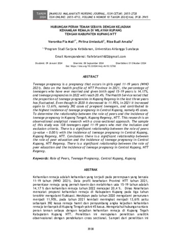 Veronika, Fia Mali and Pirlina, Umiastuti and Rize, Budi Amalia (2024) Hubungan peran teman sebaya dengan kejadian kehamilan remaja di wilayah Kupang Tengah Kabupaten Kupang NTT. Manuju: Malahayati Nursing Journal, 6 (10): 5. pp. 3938-3945. ISSN 2655-2728