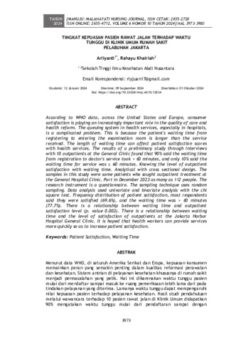 Arliyanti, Arliyanti and Rahayu, Khairiah (2024) Tingkat kepuasan pasien rawat jalan terhadap waktu tunggu di Klinik Umum Rumah Sakit Pelabuhan Jakarta. Manuju: Malahayati Nursing Journal, 6 (10): 9. pp. 3973-3980. ISSN 2655-2728