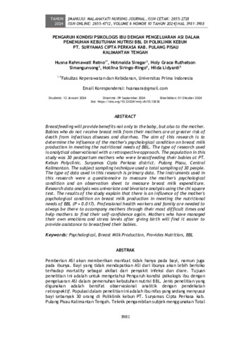 Husna, Rahmawati Retno and Hotmaida, Siregar and Holy, Grace Ruthetson Simangunsong and Hotlina, Siringo-Ringo and Hilda, Lidyanti (2024) Pengaruh kondisi psikologis ibu dengan pengeluaran ASI dalam pemenuhan kebutuhan nutrisi BBL di Poliklinik Kebun PT. Suryamas Cipta Perkasa Kab. Pulang Pisau Kalimantan Tengah. Manuju: Malahayati Nursing Journal, 6 (10): 10. pp. 3981-3988. ISSN 2655-2728