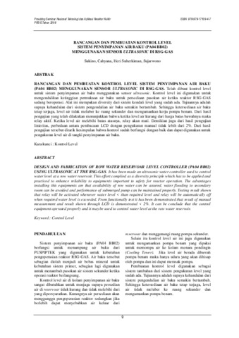 Sukino, Sukino and Cahyana, Cahyana and Suherkiman, Heri and Sujarwono, Sujarwono (2009) RANCANGAN DAN PEMBUATAN KONTROL LEVEL SISTEM PENYIMPANAN AIR BAKU (PA04 BB02) MENGGUNAKAN SENSOR ULTRASONIC DI RSG GAS. PROSIDING SEMINAR NASIONAL TEKNOLOGI DAN APLIKASI REAKTOR NUKLIR. ISSN 978-979-17109-8-5