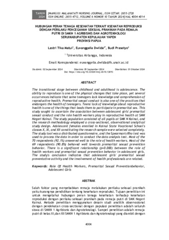 Lastri, Tika Matui and Euvanggelia, Dwilda and Budi, Prasetyo (2024) Hubungan peran tenaga kesehatan terkait kesehatan reproduksi dengan perilaku pencegahan seksual pranikah pada remaja putri di SMKN 1 Agribisnis dan Agroteknologi Serui Kabupaten Kepulauan Yapen Provinsi Papua. Manuju: Malahayati Nursing Journal, 6 (10): 13. pp. 3997-4003. ISSN 2655-2728