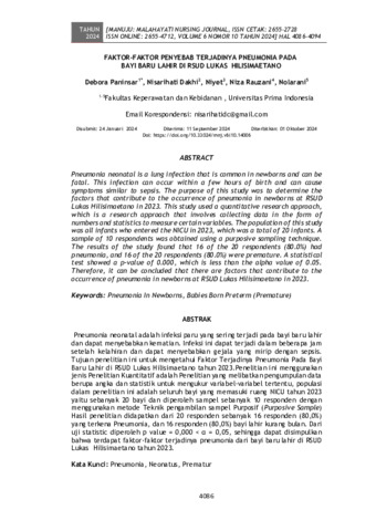 Debora, Paninsar and Nisarihati, Dakhi and Niyet, Niyet and Niza, Rauzani and Nolarani, Nolarani (2024) Faktor-faktor penyebab terjadinya pneumonia pada bayi baru lahir di RSUD Lukas Hilisimaetano. Manuju: Malahayati Nursing Journal, 6 (10): 20. pp. 4086-4094. ISSN 2655-2728