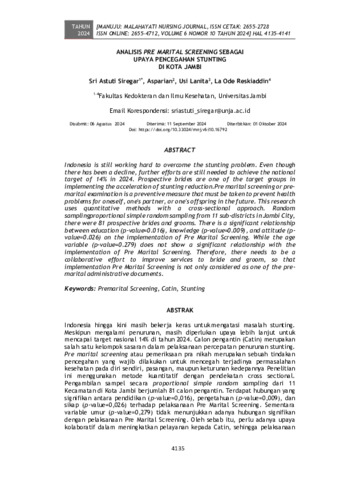 Sri, Astuti Siregar and Asparian, Asparian and Usi, Lanita and La, Ode Reskiaddin (2024) Analisis pre marital screening sebagai upaya pencegahan stunting di Kota Jambi. Manuju: Malahayati Nursing Journal, 6 (10): 24. pp. 4135-4141. ISSN 2655-2728