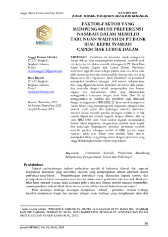 Angga, Dasma Hendra and Rino, Riyaldi (2024) Faktor-faktor yang mempengaruhi preferensi nasabah dalam memilih tabungan wadi’ah di PT Bank Riau Kepri Syariah Capem Siak Lubuk Dalam. Jurnal Manajemen Bisnis dan Keuangan (MBISKU), 1 (1): 6. pp. 50-59. ISSN 3047-4914