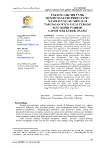 Penelitian ini bertujuan untuk mengetahui faktor -faktor yang mempengaruhi preferensi nasabah bank riau kepri syariah dalam memilih tabuangan di PT. Bank Riau Kepri Syariah Capem Siak Lubuk Dalam. Preferensi konsumen juga diartikan sebagai pilihan suka atau tidak suka oleh seseorang terhadap suatu produk, barang atau jasa yang dikonsumsi atau digunakan. Jenis Penelitian ini kuantitatif merupakan penelitian lapangan field research. Adapun jenis data yang digunakan dalam penelitian ini adalah data primer dan sekunder dengan teknik pengumpulan data berupa angket, dan dokumentasi. Data yang dikumpulkan menggunakan kuesioner dengan skala likert. Data di uji menggunakan uji validitas dan reliabilitas yang dilakukan dengan menggunakan IBM SPSS 23. Serta untuk mengetahui faktor faktor yang memepengaruhi religiusitas, pengetahuan, produk bank, sosial dan psikologis terhadap preferensi nasabah dalam memilih produk tabungan wadiah di pt brk syariah digunakan analisis logistik dengan dibantu alat uji yaitu IBM SPSS 23.0. Hasil analisis logistik menunjukkan bahwa faktor religiusitas, pengetahuan, produk bank, sosial, dan psikologis berpengaruh terhadap preferensi nasabah memilih produk tabungan wadiah di BRK syariah, tetapi terdapat salah satu faktor yaitu produk bank dimana merupakan faktor yang paling utama dengan persentase yang tinggi dibandingkan faktor-faktor yang lainnya.