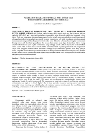 PENGUKURAN TINGKAT KONTAMINASI PADA ISOTOP CELL FASILITAS IRADIASI SISTEM RABBIT DI RSG-GAS. Fasilitas iradiasi sistem rabbit adalah salah satu dari beberapa fasilitas iradiasi di RSG-GAS, ada 2 jenis fasilitas iradiasi sistem rabbit yaitu : Hydraulic rabbit dan Pneumatic rabbit sistem. Pada saat pemasukan dan pengeluaran sampel sering terjadi gangguan pada drum pengiriman sampel sehingga harus ada pekerja radiasi yang masuk kedalam ruang isotop cell untuk melakukan perbaikan, untuk memantau dan mengendalikan kegiatan tersebut maka harus diketahui seberapa besar tingkat kontaminasi diruang isotop cell. dari hasil pengukuran dan pencacahan sampel usap dapat disimpulkan bahwa ruang tersebut terkontaminasi yaitu tingkat kontaminasi yang tertinggi adalah : 263,39 Bq/cm², hal ini diakibatkan karena secara rutin fasilitas iradiasi sistem rabbit beroperasi untuk kegiatan pemasukan dan pengeluaran sampel oleh pengguna selama reaktor beroperasi sehingga terjadi akumulatif partikel beta. Bagi pekerja radiasi yang akan memasuki ruang tersebut untuk melakukan perbaikan maka harus didampingi oleh petugas proteksi radiasi sebagai penanggung jawab dalam mengendalikan daerah kerja sehingga pekerja radiasi dapat bekerja dengan aman dan terkendali.