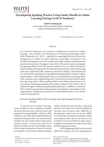 Indah, Werdiningsih (2022) Investigating speaking practice using estudy moodle in online learning during Covid 19 Pandemic. Journal of English Language, Literature, and Teaching (ELLITE), 7 (1): 4. pp. 27-32. ISSN 2527-4120