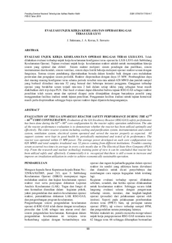 EVALUASI UNJUK KERJA KESELAMATAN OPERASI RSG-GAS TERAS LXII-LXVI. Telah dilakukan evaluasi terhadap unjuk kerja keselamatan konfigurasi teras operasi ke LXII-LXVI oleh Subbidang Keselamatan Operasi. Tujuan evaluasi unjuk kerja keselamatan reaktor adalah untuk menunjukkan kinerja sistem yang optimal dan efektif. Sistem reaktor meliputi: sistem pendingin dan purifikasi, sistem instrumentasi dan kendali, sistem ventilasi, sistem daya listrik bekerja melayani operasi reaktor sesuai dengan fungsinya. Semua sistem pendukung dipertahankan berada dalam kondisi baik dengan cara melakukan perawatan dan pengujian secara periodik. Reaktor dioperasikan dengan daya 15 MW. Pembangkitan daya dari masing-masing konfigurasi teras selama periode tersebut rata-rata adalah 628 MWD dan jumlah sampel yang berhasil diiradiasi rata-rata 52 yang berasal dari beberapa instansi pengguna. Gangguan terhadap operasi yang berakibat scram terjadi rata-rata 2 kali dalam setiap siklus yang sebagian besar masih diakibatkan oleh trip daya PLN. Dari hasil evaluasi dapat diketahui bahwa tujuan RSG-GAS sebagai reaktor penelitian telah secara aman dan optimal dicapai yaitu ditunjukkan dengan banyaknya peneliti yang menggunakan fasilitas iradiasi untuk tujuan penelitian. Penggunaan fasilitas iradiasi untuk tujuan komersial masih perlu dioptimalkan sehingga biaya operasi reaktor dapat dijamin kelangsungannya.