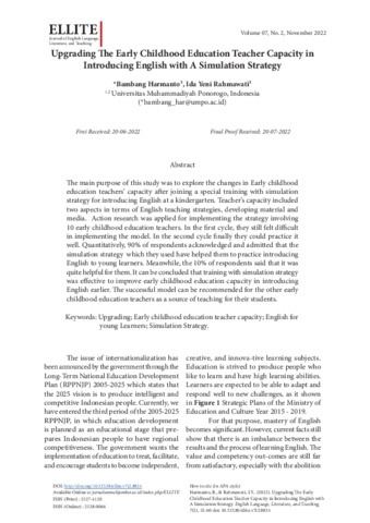 Bambang, Harmanto and Ida, Yeni Rahmawati (2022) Upgrading the early childhood education teacher capacity in introducing english with a simulation strategy. Journal of English Language, Literature, and Teaching (ELLITE), 7 (2): 1. pp. 52-60. ISSN 2527-4120