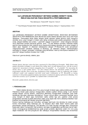 UJI LAPANGAN PERANGKAT DETEKSI GAMMA DENSITYHASIL REKAYASA BATANPADA INDUSTRI & PERTAMBANGAN.Telah dikonstruksi sistem deteksi densitas aliran slurry oleh Pusat Rekayasa Perarangkat Nuklir Batan dengan teknik absorpsi radiasi gamma untuk mengukur densitas slurry yang mengalir di dalam pipa tailing tambang pada proses pengolahan tambang emas, dengan ketelitian ukur antara 1 gram/dm3 sampai 15 gram/dm3. Untuk mengukur densitas slurry digunakan sumber pemancar gamma jenis 137Cs dan detector scintilasi, intensitas radiasi gamma yang terabsorbsi oleh material slurry proporsional dengan densitas slurry yang mengalir di dalam pipa. Kegiatan ini dilakukan bekerjasama dengan PT.RecsaLOG suatu perusahaan integrasi/konsultan peralatan tambang di Bandung. Uji dilakukan dengan membandingkan perangkat ini, dengan perangkat timbangan yang terkalibrasi. Hasil uji menunjukan kesalahan 2,4 gram/dm3 dengan koefisien korelasi linier 0,985.