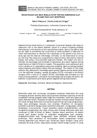 Rahmi, Wahyuna and Farida, Linda Sari Siregar (2024) Pengetahuan dan sikap remaja putri tentang kebersihan alat kelamin pada saat menstruasi. Manuju: Malahayati Nursing Journal, 6 (10): 29. pp. 4199-4206. ISSN 2655-2728