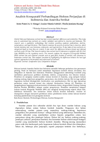 Irene, Puteri A. S. Sinaga and Louise, Shania Sabela and Thalia, Jamiana Kuang (2024) Analisis komparatif perbandingan hukum perjanjian di Indonesia dan Amerika Serikat. Fairness and Justice : Jurnal Ilmiah Ilmu Hukum, 22 (1): 3. pp. 23-30. ISSN 1858-0106