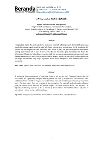 Syaiful, Amri and Robinsar, H. Simanjuntak (2024) Gaya laku seni tradisi. Jurnal Seni Pertunjukan (BERANDA), 1 (2): 5. pp. 51-57. ISSN 1979-7214