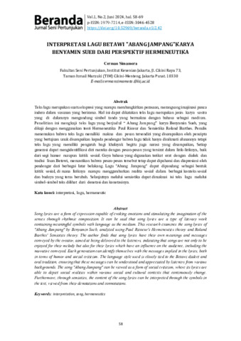 Cerman, Simamora (2024) Interpretasi lagu Betawi "Abang Jampang" karya Benyamin Sueb dari perspektif hermeneutika. Jurnal Seni Pertunjukan (BERANDA), 1 (2): 6. pp. 58-69. ISSN 1979-7214