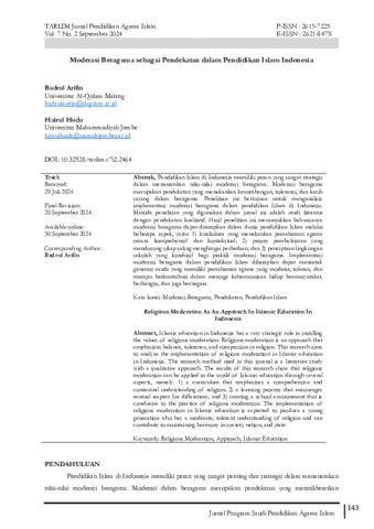Badrul, Arifin and Hairul, Huda (2024) Moderasi beragama sebagai pendekatan dalam pendidikan islam Indonesia. Jurnal Pendidikan Agama Islam (TARLIM), 7 (2): 2. pp. 143-154. ISSN 2615-7225