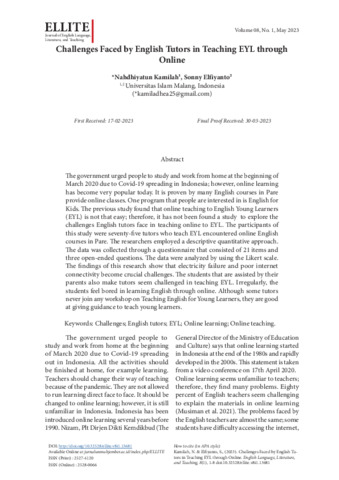Nahdhiyatun, Kamilah and Sonny, Elfiyanto (2023) Challenges faced by English tutors in teaching EYL through online. Journal of English Language, Literature, and Teaching (ELLITE), 8 (1): 1. pp. 1-8. ISSN 2527-4120